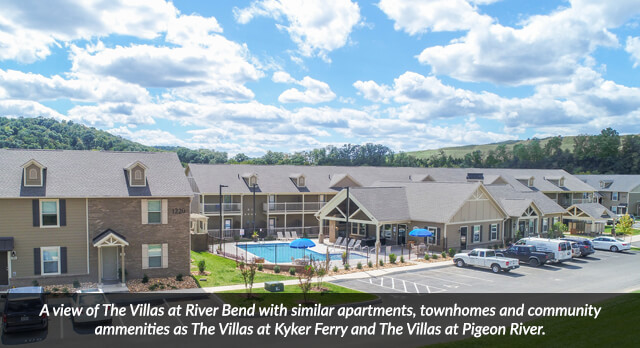 Located near the French Broad River between Kyker Ferry Road and the Winfield Dunn Parkway, the Villas at Kyker Ferry will offer one, two and three bedroom townhomes and apartments, many with drive-under garages. The Villas at Pigeon River will be located between the Little Pigeon River and the Winfield Dunn Parkway near the Sevierville Golf Club and the Wilderness Adventure water park and it too will feature one, two and three bedroom townhomes and apartments.